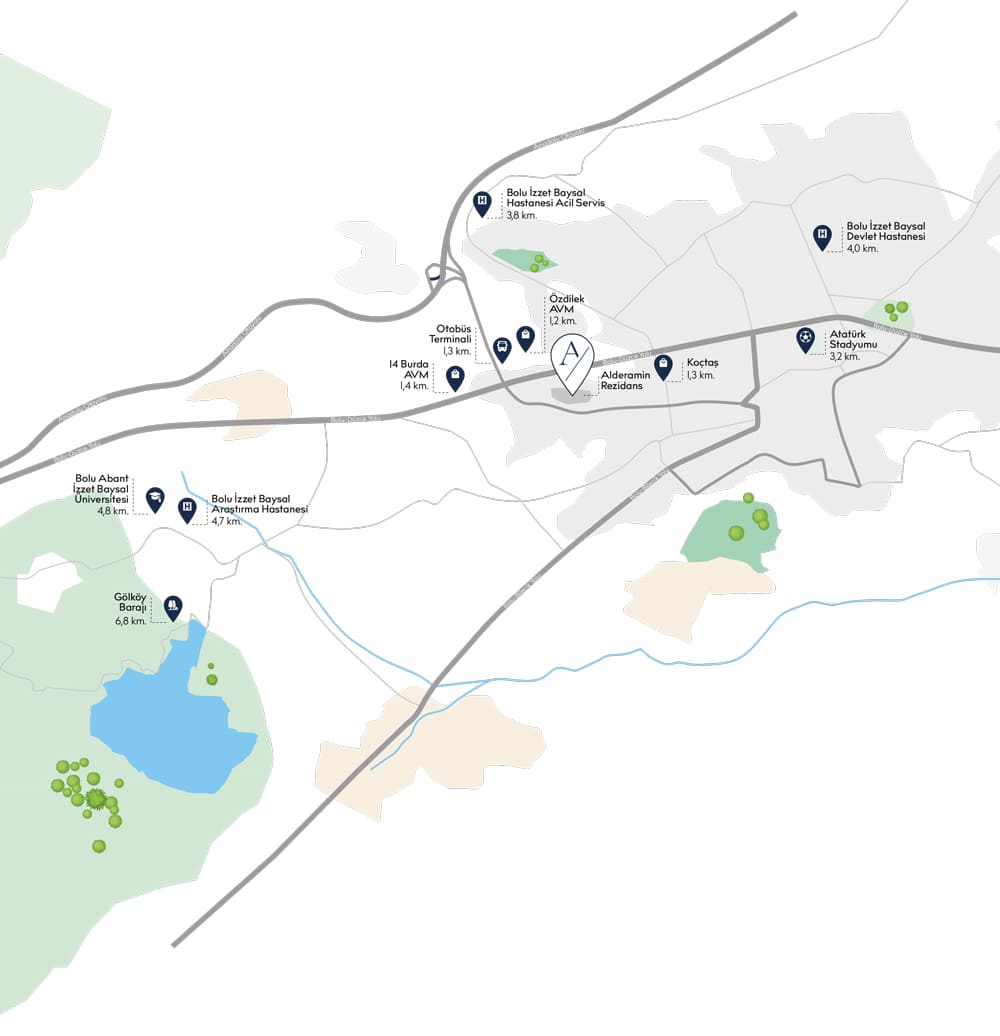 Türkiye’nin Başkenti Ankara ile Dünya’nın Başkenti İstanbul’un tam ortasında, önde gelen ticaret, sanayi, turizm merkezlerine komşu ve eşsiz doğası ile de kalabalıklara bir o kadar uzak olan Bolu’nun tam kalbinde yer alan Alderamin Rezidans; Bolu Otogar’ın karşısında, Ankara – İstanbul otobanı ve E-5 karayolunun yanı başında, Valiliğe 1 km, Özdilek ile 14 Burda AVM’lerine yürüme mesafesinde, Bolu İzzet Baysal Üniversitesi’ne 4 km ve şehir merkezine de yalnızca 1 km uzaklıkta eşsiz bir konumda yer alıyor.